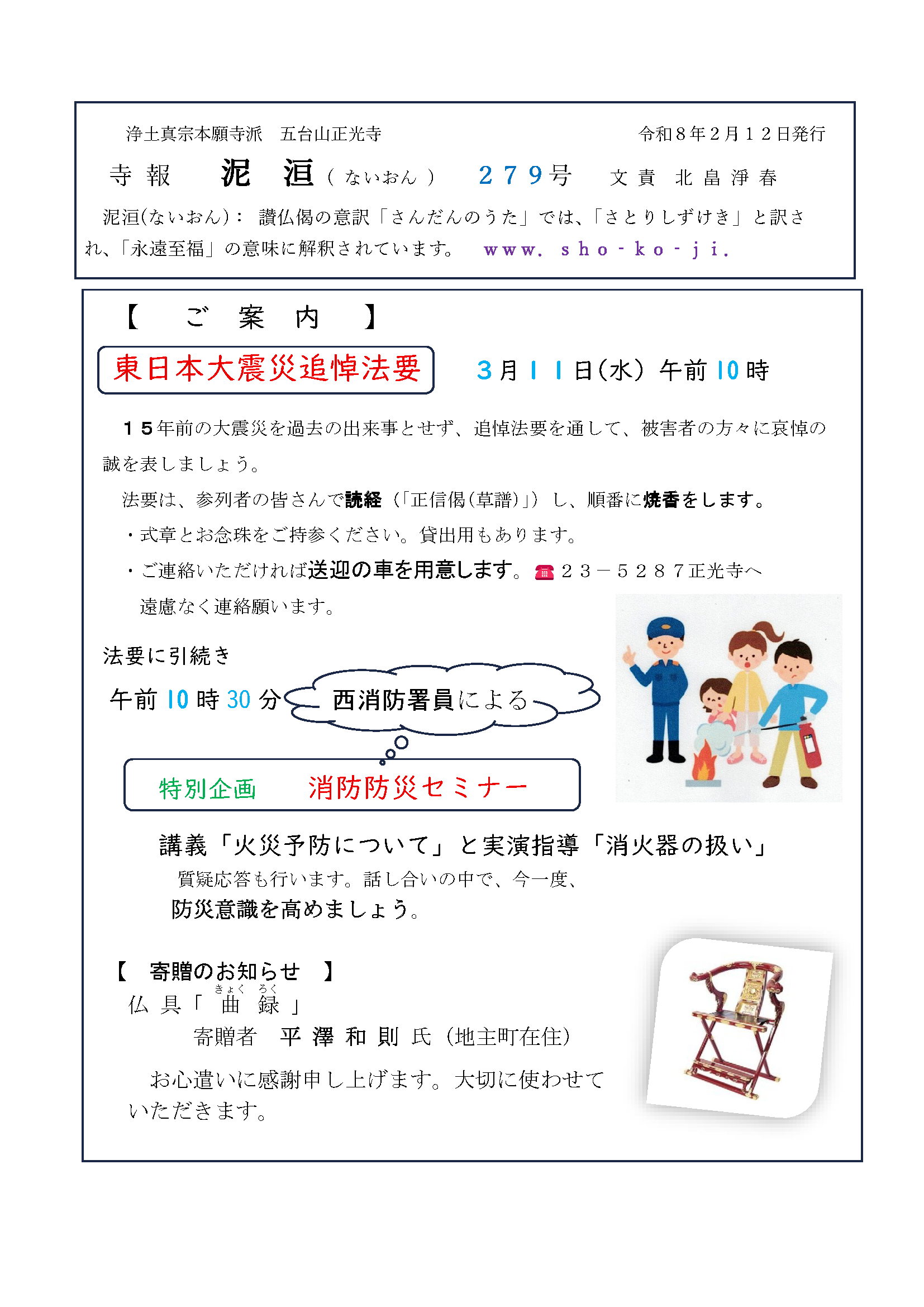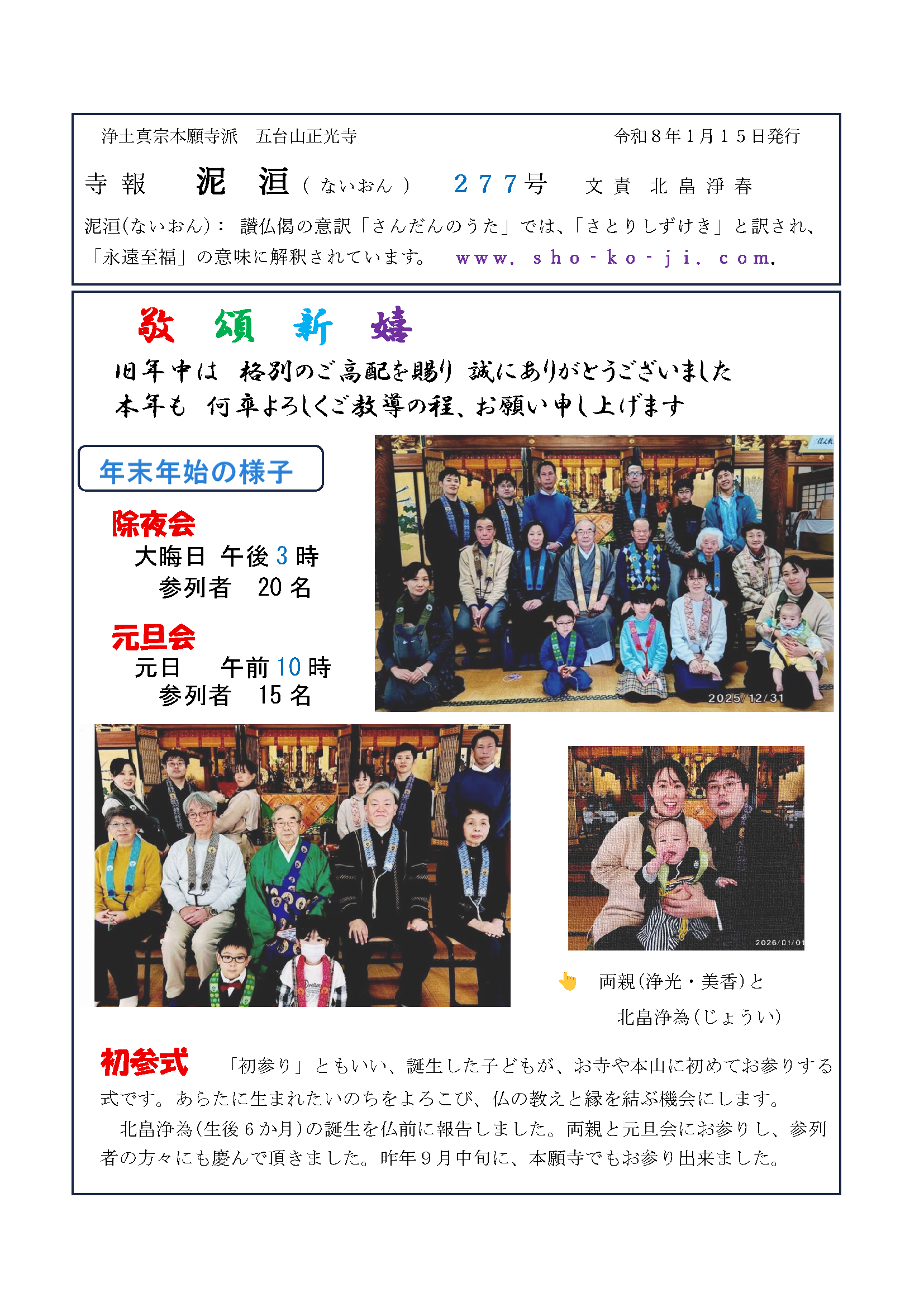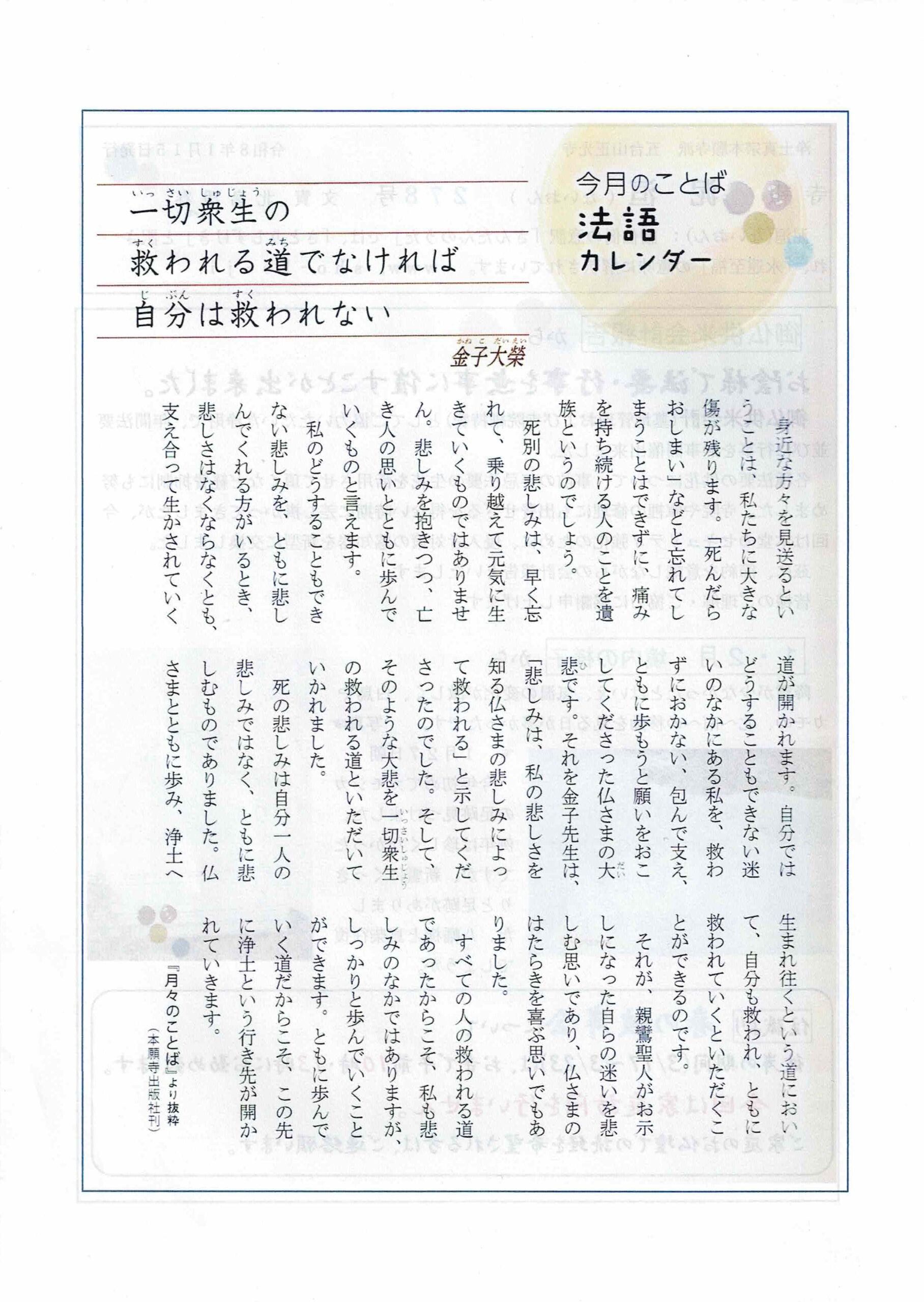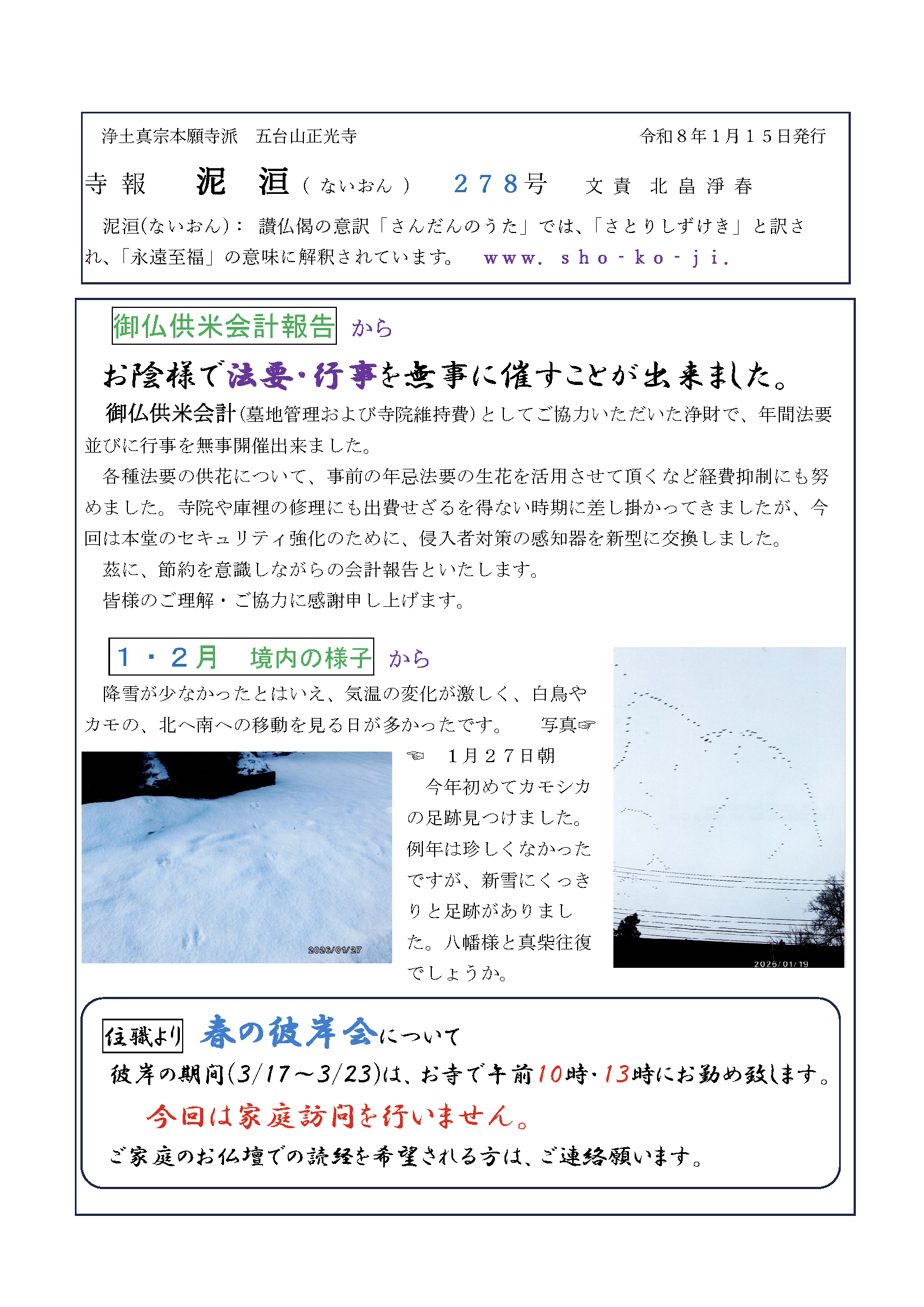 寺報 泥洹(ないおん)277号、278号、279号、号外〜京都の風〜 2026 2/18 寺報(泥洹) 2026年2月18日 こんにちは 正光寺の住職です。 寺報『泥洹〜ないおん〜』の最新号をアップします。 どうぞご覧ください。 寺報 泥洹(ないおん)277号 泥洹277号A面 泥洹277号B面 寺報 泥洹(ないおん)278号 泥洹278号A面 泥洹278号B面 寺報 泥洹(ないおん)279号 号外〜京都の風〜 泥洹279号A面 泥洹279号B面 南無阿弥陀仏 合掌岩手・一関正光寺住職 北畠淨春 寺報(泥洹) よかったらシェアしてね! URLをコピーしました! URLをコピーしました! 二月の言葉(2026) 関連記事 寺報 泥洹(ないおん)274号、275号、276号 2025年12月22日 寺報 泥洹(ないおん)271号、272号、273号 2025年9月30日 寺報 泥洹(ないおん)269号、270号 2025年8月19日 寺報 泥洹(ないおん)268号 2025年7月22日 寺報 泥洹(ないおん)267号 2025年6月24日 寺報 泥洹(ないおん)265号、266号 2025年6月11日 寺報 泥洹(ないおん)264号、号外〜京都の風〜 2025年4月19日 寺報 泥洹(ないおん)262号、263号 2025年2月16日