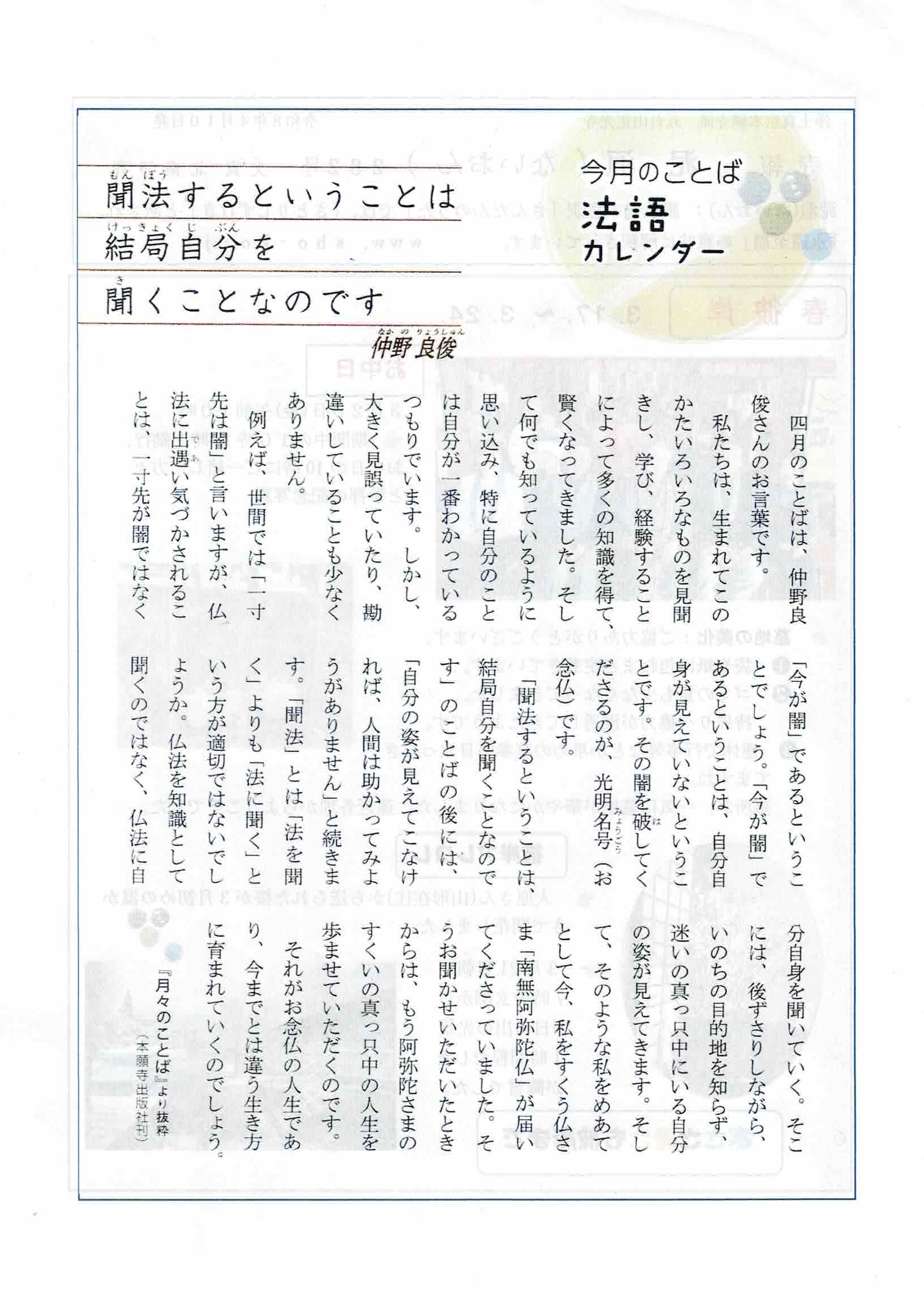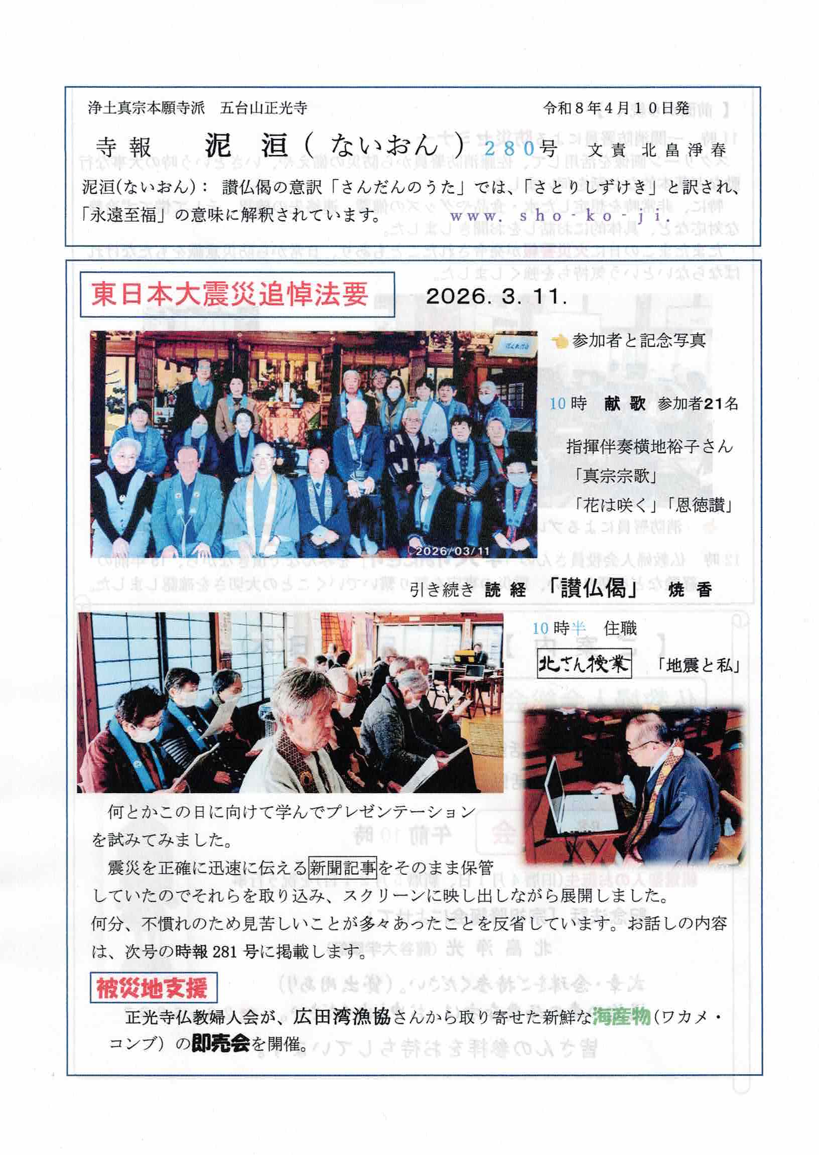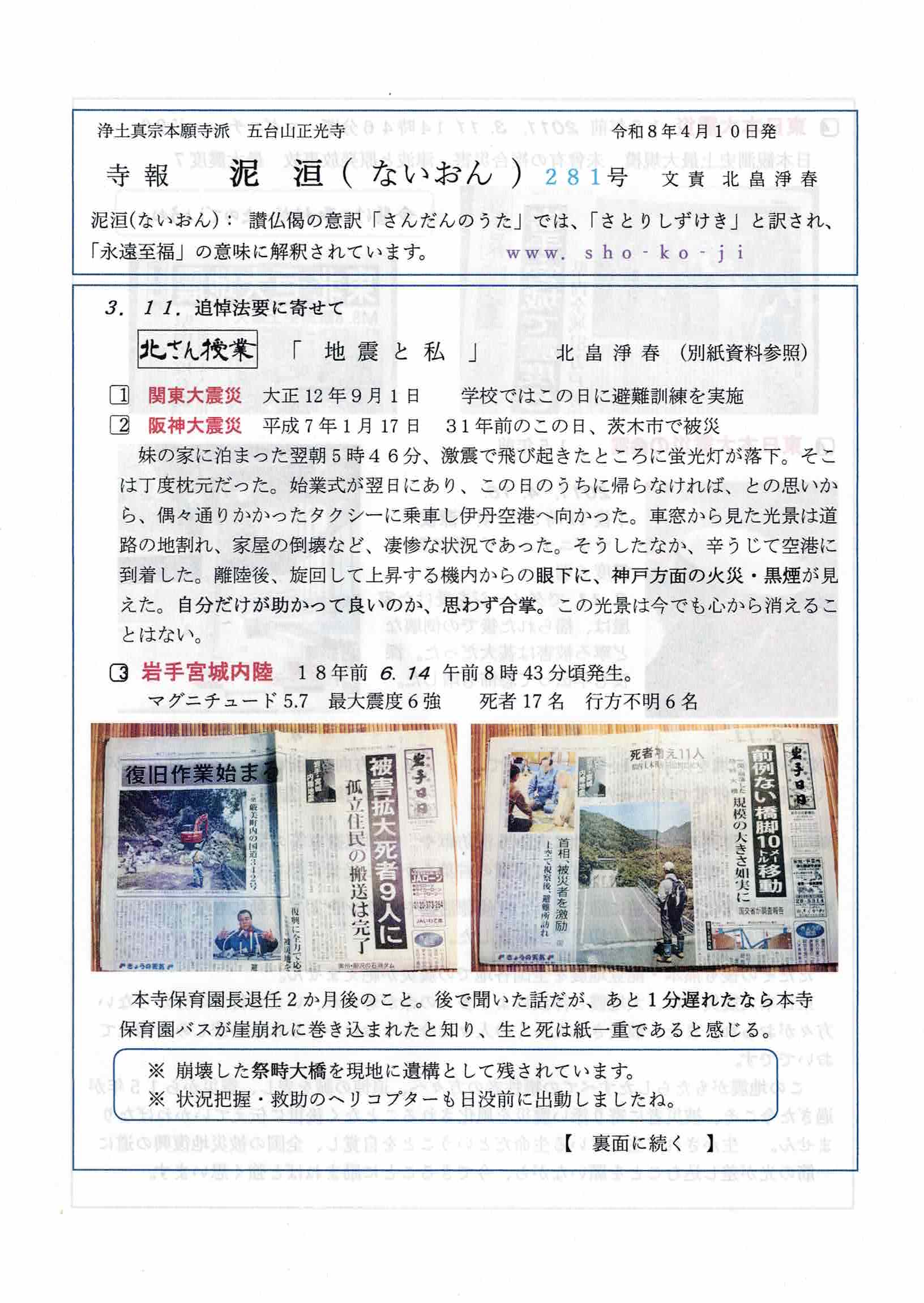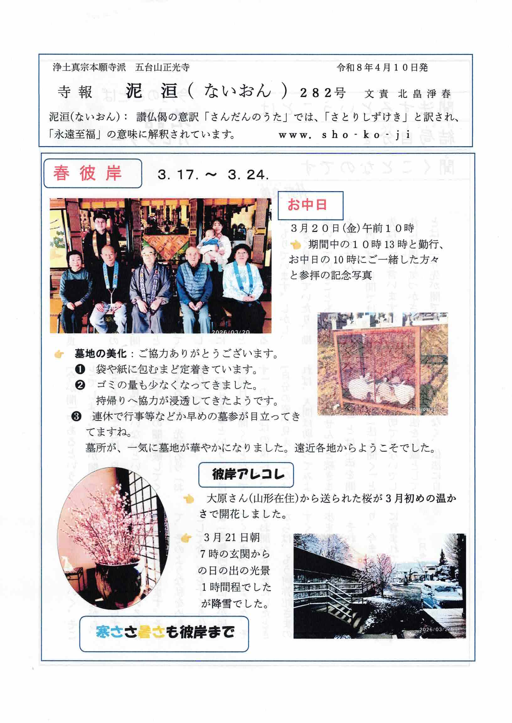 寺報 泥洹(ないおん)280号、281号、282号 2026 4/15 寺報(泥洹) 2026年4月15日 こんにちは 正光寺の住職です。 寺報『泥洹〜ないおん〜』の最新号をアップします。 どうぞご覧ください。 寺報 泥洹(ないおん)280号 泥洹280号A面 泥洹280号B面 寺報 泥洹(ないおん)281号 泥洹281号A面 泥洹281号B面 寺報 泥洹(ないおん)282号 泥洹282号A面 泥洹282号B面 南無阿弥陀仏 合掌岩手・一関正光寺住職 北畠淨春 寺報(泥洹) よかったらシェアしてね! URLをコピーしました! URLをコピーしました! 四月の言葉(2026) 関連記事 寺報 泥洹(ないおん)277号、278号、279号、号外〜京都の風〜 2026年2月18日 寺報 泥洹(ないおん)274号、275号、276号 2025年12月22日 寺報 泥洹(ないおん)271号、272号、273号 2025年9月30日 寺報 泥洹(ないおん)269号、270号 2025年8月19日 寺報 泥洹(ないおん)268号 2025年7月22日 寺報 泥洹(ないおん)267号 2025年6月24日 寺報 泥洹(ないおん)265号、266号 2025年6月11日 寺報 泥洹(ないおん)264号、号外〜京都の風〜 2025年4月19日